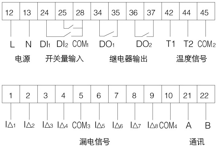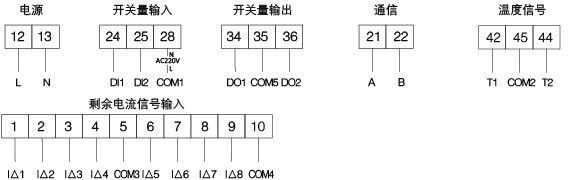 ● 實時監測一路剩余電流,一路溫度。可選配三相電流,三相電壓,頻率,功率,四象限電能等電參量監測(具體見儀表選型);