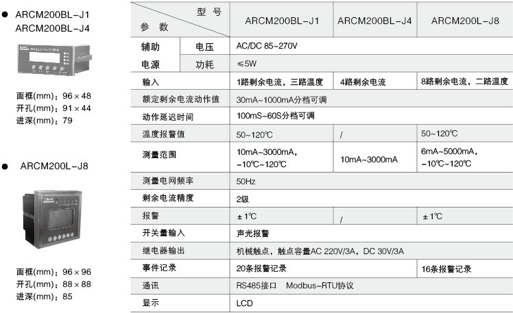 ● ARCM200L-J1、ARCM200L-J4具有事件存儲功能,報警器能夠記錄報警發生的時間、類型、參數,根據報警記錄可以分析現場的用電情況,為消除故障提供依據;