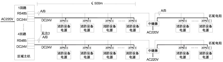 ?傳輸距離大于500m時,需加中繼器,1合中繼器占用1個傳感器(監(jiān)控模塊)地址,中繼器的AC220V電源線采用3*1.5mm^2,由現(xiàn)場消防電源或消防監(jiān)控室監(jiān)控器(主機)提供。