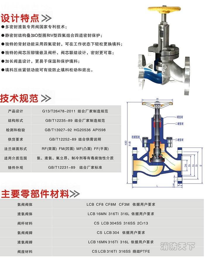 氨用截止閥都裝有安全閥。它是保護氨氣減壓閥并使之安全使用的裝置,也是氨氣減壓閥出現故障的信號裝置。如果由于活門墊、活門損壞或由于其它原因,導致出口壓力自行上升并超過一定許可值時,安全閥會自動打開排氣。