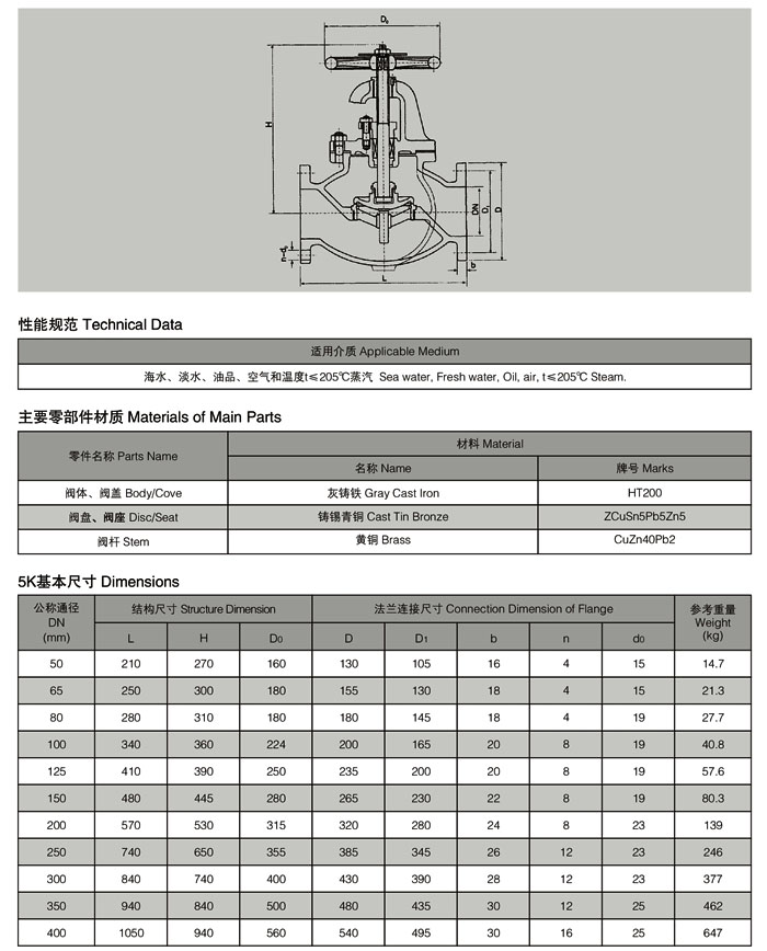 5K/10K/16K Marine Cast Iron Flanged Globe Stop Valves