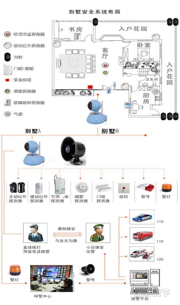 室外入戶花園的圍欄處安裝主動紅外探測器,門外安裝戶外被動紅外探測器。