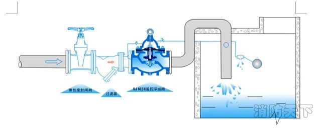 100X遙控浮球閥主要安裝于水池或水塔的進口處,當水位達到設定離度時,主閥由浮球導閥控制關閉進水口停止供水,當水位下降后,主閥由浮球導閥開關控制打開進水口向水池或水塔供水,實現自動補水。