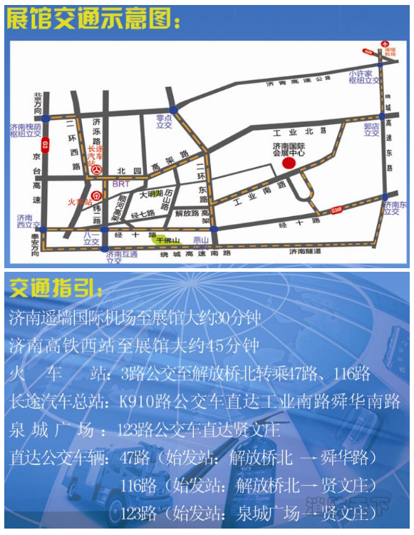 濟南國際會展中心坐落在歷史文化名城濟南的市區(qū)東部—國家級濟南高新技術(shù)產(chǎn)業(yè)開發(fā)區(qū)最具現(xiàn)代化、最具聚集力的中心商務(wù)地帶。南臨市區(qū)主干道工業(yè)南路,東連與濟青、京福高速公路相通的繞城高速公路,西接中心城區(qū)二環(huán)東路。地理位置優(yōu)越,交通便捷通暢。建筑雄偉、設(shè)施先進、配套齊全,其規(guī)模化、現(xiàn)代化和專業(yè)化在中國內(nèi)會展場館中位居前列。