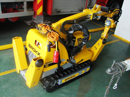 布魯克50,英文名為Brokk50,原產于瑞典,重500公斤,200余萬元。其外觀類似于挖土機,主要由臂系統、旋轉功能系統、驅動系統、支腳、作業工具和控制臺六個部分組成,其功率5.5千瓦,以380伏電壓為工作動力,可遠距離無線電遙控,主要用于安全和諸如機器翻到、支撐物不安全或非常熱等不安全環境下的破拆、挖掘、開槽、搬運物料,其效作業區域在高2.9米、遠2.7米的范圍內,并可連續工作500個小時不間斷。Brokk機器的模塊化生產使得機器的適用于多種工作和各種不同環境成為可能,其工作臂前端可更根據不同作業需求裝配不同的工具,如液壓沖擊器、液壓剪等。目前,成都、青島等消防部門配備了該款消防機器人。