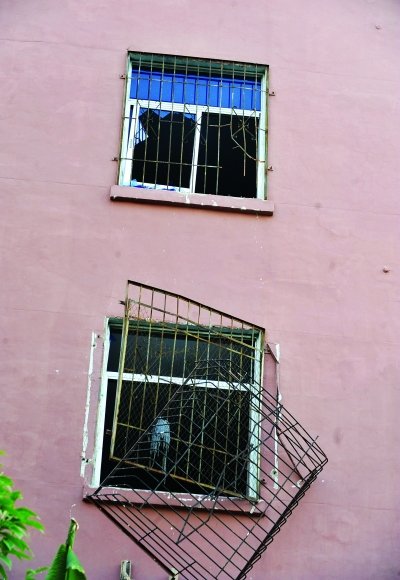 事發酒店窗戶外的鐵護欄被逃生者砸開。