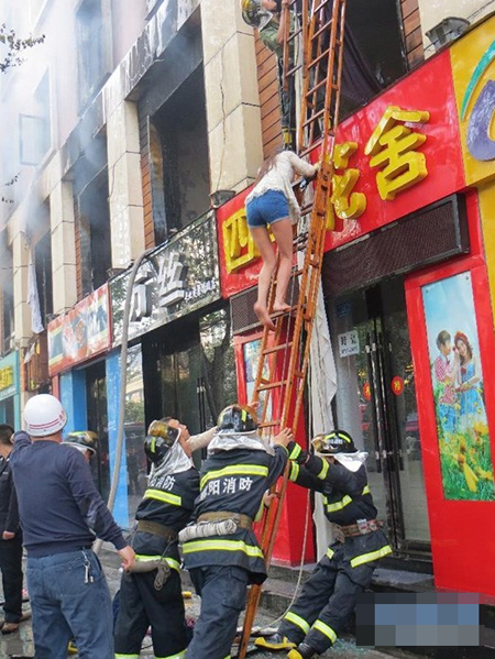 4月14日,襄陽市樊城區前進東路一景城市花園酒店發生火災,消防隊員用梯子救出一名女子。