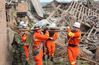 消防天下網訊 成都消防官兵從廢墟里面救出以為癱瘓在家的老人。