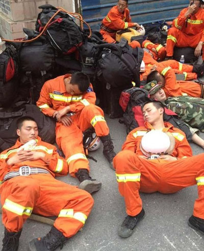 消防天下網訊 消防官兵行至老關口時遭遇山體滑坡,行程受阻,官兵們抓住短暫的時間進行休整,此時,睡姿和形象已經不再重要。