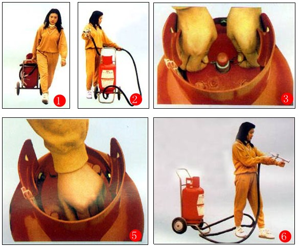 ⑤左手把持噴粉槍管托,右手把持槍把用手指扳動噴粉開關,對準火焰噴射,不斷靠前左右擺動噴粉槍,把干粉籠罩住燃燒區,直至把火撲滅為止。