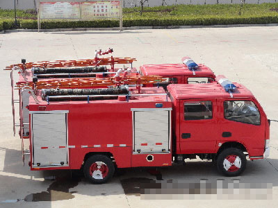 此次購進的水罐消防車為天河牌SG30型消防水罐車,該車采用東風汽車底盤改裝,車長:7049厘米,寬:2333厘米,高:3251厘米,最高車速90km/h,額定載質量3450kg。整車設計合理,空間利用率高,液罐防腐性能好;器材廂為框架結構,布置科學,取用方便,人性化設計,主要組成部分有容罐、器材箱、消防泵、消防炮、以及電器系統、傳動系統等。