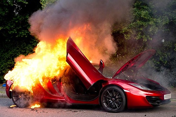 核心提示:價值20萬英鎊(約合200萬元)的超級跑車邁凱輪MP4在大火中被燒毀,司機受到驚嚇逃了出來,只受到輕度燒傷。