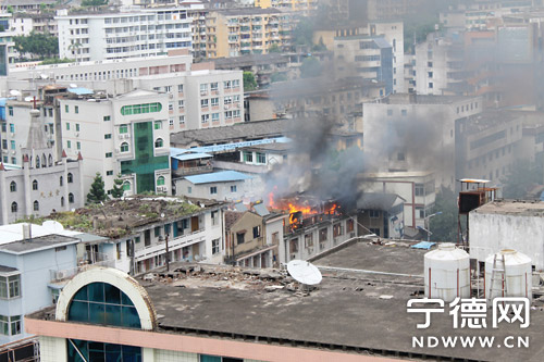 10月7日下午3時許,蕉城區(qū)汽車北站旁一民房的露天陽臺突發(fā)大火。在附近一座大樓頂部看到,一排民房樓頂冒出赤紅火焰,許多晾曬著的棉被衣物燃燒著,濃濃黑煙不斷涌向天空。