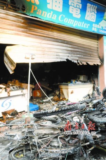 這家起火的熊貓電腦店位于一棟9層樓房的首層。主要經營電腦的配件及維修,經營面積約20平方米,其中過火面積約10平方米。