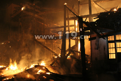 3時18分,消防官兵抵達火災現場,只見火光沖天,熊熊烈火燒穿了房頂,屋內墻壁開始坍塌,整幢民房處于猛烈燃燒階段,現場一片嘈雜混亂。起火的民房是一棟土木結構的老屋,屋內有液化氣罐,劇烈燃燒的老屋正向毗鄰清代祠堂和周邊密集的磚木結構民房蔓延,若不及時對肆虐的大火進行圍剿撲滅,很有可能引燃清代祠堂和周邊民房,造成古建筑的損毀和巨大的經濟損失。