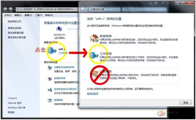 單擊“查看活動網絡”下的“工作網絡“(或是”家庭網絡“、”公用網絡“)選項,彈出”設置網絡位置“選擇”家庭網絡“或”工作網絡“,根據系統提示進行設置。