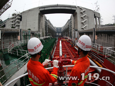 5月21日上午9時,共載有近一萬噸汽油的6艘危險品船舶欲通過三峽船閘前往重慶,為防止發生安全事故,三峽壩區特勤消防派出15名官兵,分別在閘室兩岸和船舶上巡查布控,歷時4小時安全將船舶送出船閘。據大隊長王武量介紹,三峽消防大隊平均每天都要執行一次護航任務,建隊10年來,累計護送7480余艘危化品船舶、1210萬噸危化品安全通過船閘,實現船舶護航“零事故”。