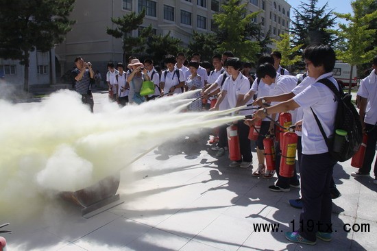 演練中,年級值班領導在接到火警訊息后,迅速通過廣播告知師生發生突發情況,要求立即組織有效撤離。“正在上課”的教師們迅速組織學生從教室前后兩門,依據最不利點最先疏散的原則,按平時緊急疏散路線,撤離“火災”現場。疏散中,同學們拿出平時備用的毛巾迅速地用礦泉水澆濕并捂住口鼻,在老師的帶領下貓著腰有序地前行,穿過走廊,通過樓梯,迅速跑向操場。疏散結束后,在消防官兵的指導下,同學們反復演練了滅火器等常用消防設備的使用方法。