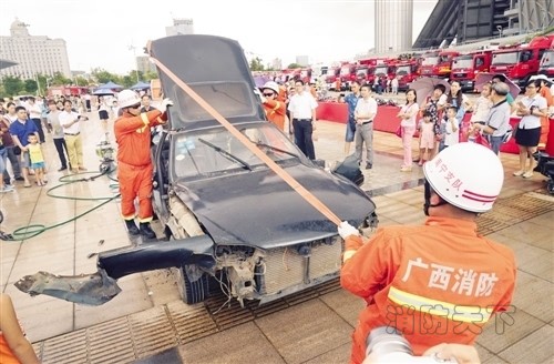 “這是城市主戰消防車,采用國內最先進的消防車專用底盤,集偵檢、破拆、救生、堵漏、排煙等多種搶險救援及滅火功能于一身……”昨日上午,廣西體育中心B區大門廣場上整齊排列各類消防車,解說員黃尚武正在向在場市民介紹車輛性能,并展示高空射水功能。