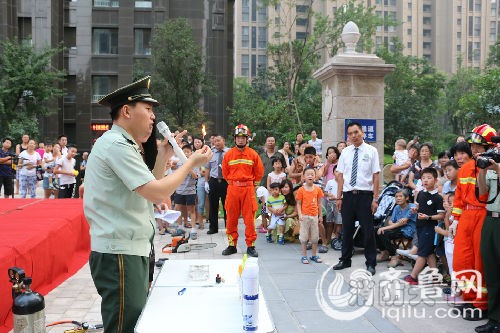在2015“樂在社區 ‘暑’我精彩 生活歡樂送”安全公益行第五站——綠地盧浮宮社區,濟南消防員現場點火,進行消防常識實戰演示,發膠、花露水等日常用品遇明火瞬間燃燒變“噴火罐”