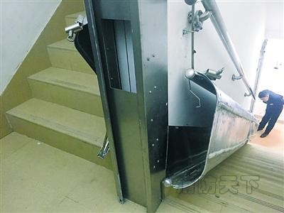 安裝電梯的居民樓位于八八中心·金廷小區(qū),樓高26層,每層有兩個(gè)單元。前日下午,記者在大樓底層消防通道內(nèi)看到,滑梯全部收起,側(cè)掛在消防梯扶手上,銜接處有不銹鋼材質(zhì)的金屬扣,滑梯本身為鋁合金材質(zhì)。由于滑梯弧度不大,寬度在50厘米左右,因此收起后并未占據(jù)逃生通道過多空間。
