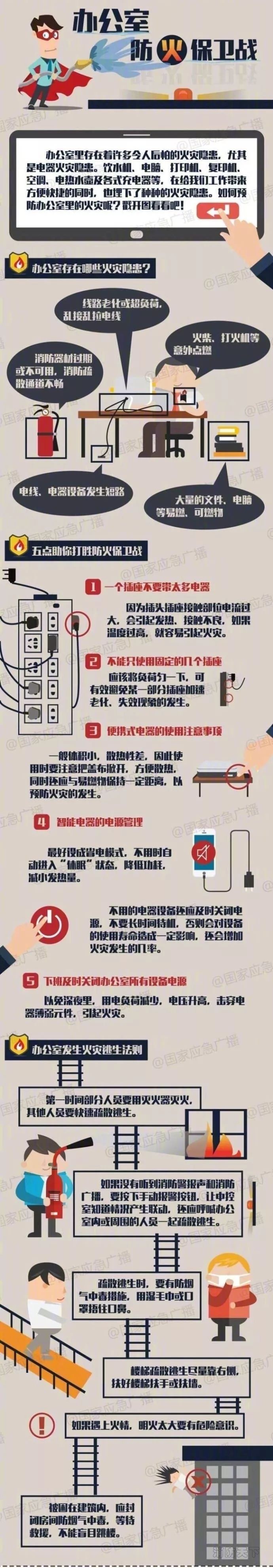 安全隱患,飲水機、電腦、打印機、復印機、空調、電熱水壺及各式充電器等,在給我們工作帶來便捷的同時,也埋下了種種火災隱患。如何預防辦公室里的火災呢?戳圖,一起來學習吧!