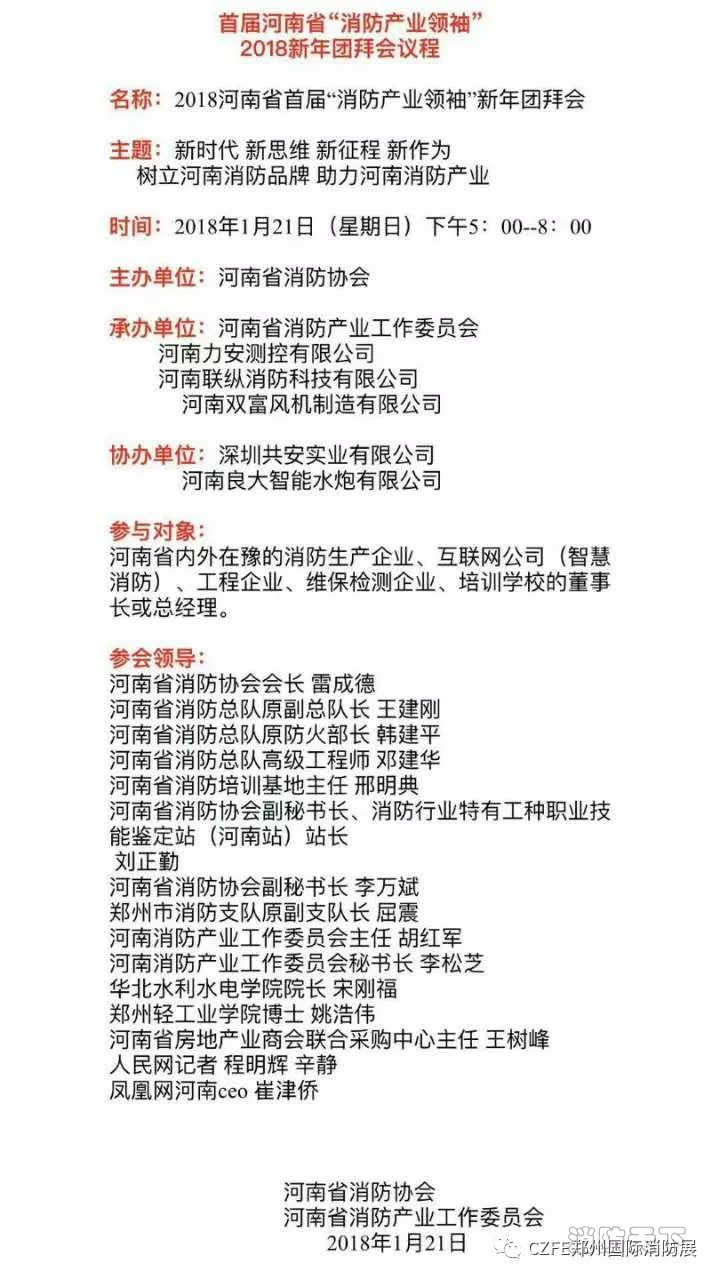 由河南省消防協(xié)會主辦,河南消防產(chǎn)業(yè)工作委員會承辦的河南省消防產(chǎn)業(yè)“領(lǐng)袖”2018新年團(tuán)拜會,1月21日下午在鄭州市逸泉國際酒店隆重舉行。