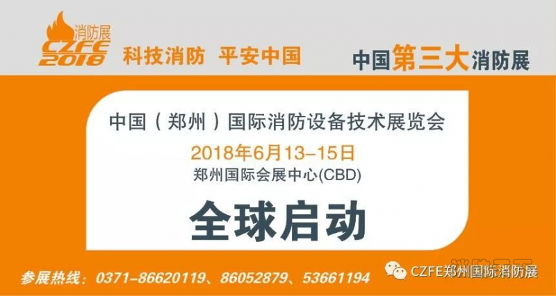 由河南省消防協會主辦,河南消防產業工作委員會、威博會展聯合承辦的2018第九屆中國(鄭州)國際消防設備技術展覽會將于2018年6月13-15日在鄭州國際會展中心盛大召開!