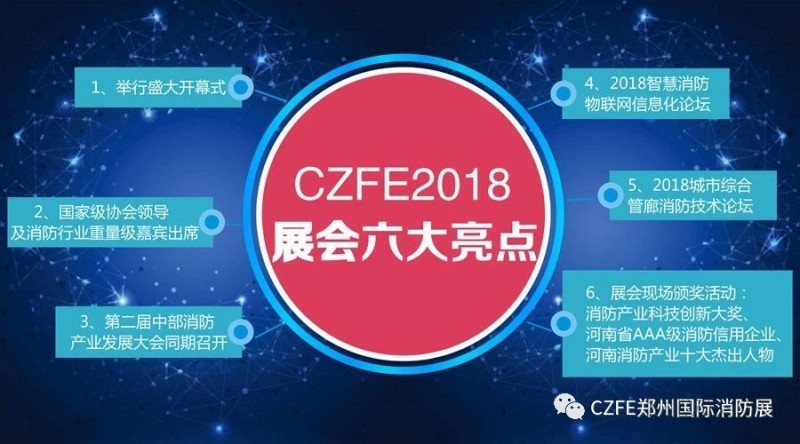 CZFE2018鄭州國際消防展將分為:消防電子報警類、智慧消防物聯網、建筑防火(消防風機、防火門、防火涂料等)類、消防裝備及器材類、應急救援裝備類、安全防護用品類、消防安全教育類、消防工程成果展示類等八大類別上千種展品。