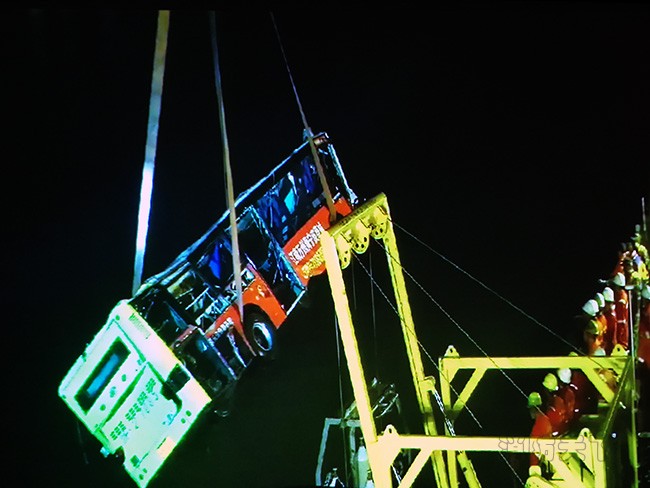 31日零點50分,公交車“黑匣子”行車記錄儀被成功打撈出水,并交到當(dāng)?shù)毓膊块T。凌晨6時許,潛水員開始進(jìn)行墜江公交車拴套、固定工作。晚上19時許,拴套固定工作結(jié)束。潛水員經(jīng)過2個半多小時出水后,現(xiàn)場救援進(jìn)入最關(guān)鍵的第三個步驟,利用長江救援2號浮吊船起吊墜江公交車,這個階段的艱巨任務(wù)由國家水上應(yīng)急救援重慶長航隊承擔(dān)。21時30分,開始進(jìn)行起撈作業(yè)。經(jīng)過2個小時的緊張作業(yè),23時30分,墜江公交車成功出水。