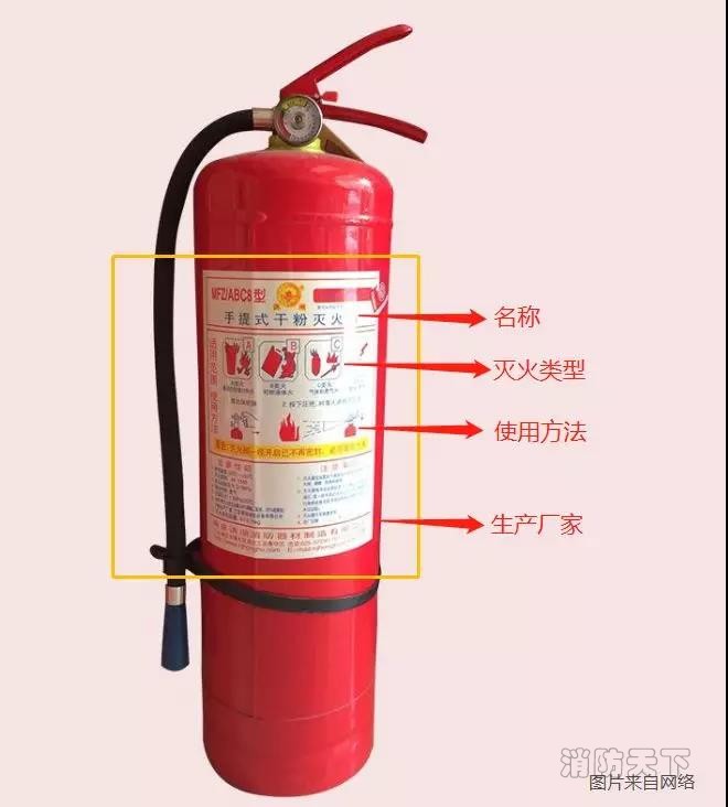 滅火器上都會有標識,標識上會有滅火器名稱、類型、使用方法、檢驗證、生產廠家等信息。