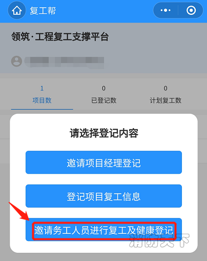 (將原有務工人員邀請關聯項目,及時把握務工人員健康狀態、行程信息,合理安排工人的復工時間。只需要把小程序碼通過微信分享給工人或項目群,工人即可直接在小程序中填報自己的信息)