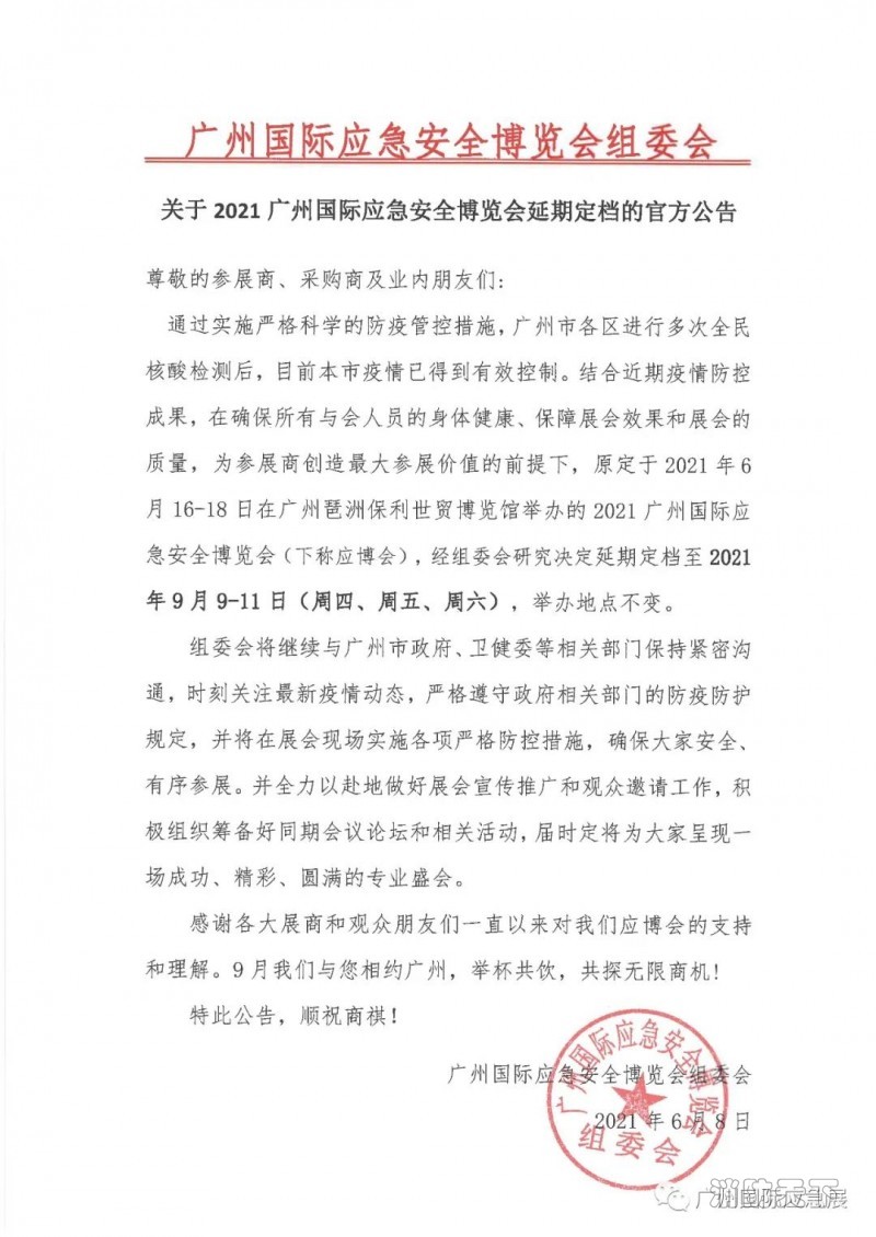 關(guān)于2021廣州國(guó)際應(yīng)急安全博覽會(huì)延期定檔的官方公告