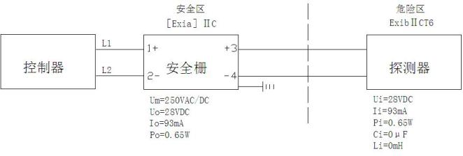 其中:Cc、Lc:安全柵到探測器之間連接電纜(或導線)允許總的最大分布電容和電感;Uo:安全柵的最高輸出電壓;Io:安全柵的最大輸出電流;Po:安全柵的最大輸出功率;Lo:安全柵允許的最大外部電感;Co:安全柵允許的最大外部電容;Ui:探測器的最高輸入電壓;Ii:探測器的最大輸入電流;Pi:探測器的最大輸入功率;Li:探測器的最大內部電感;Ci:探測器的最大內部電容。