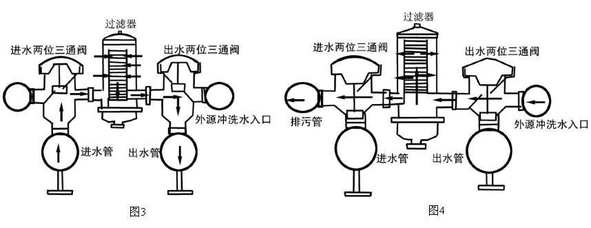 待處理水由進水關進入兩位三通閥,經閥門控制,水流進入各個過濾單元過濾。過濾后的水從過濾單元內部通道流入出水閥,經閥門控制進入出水管。當壓力差達到設定值或設定時間時,系統進入反沖洗模式,控制器首先發信號給第一個過濾單元對應的三通閥,該閥改變水流的方向,進水三通閥關閉進水導通排污口,出水三通閥關閉出水導通外沖洗水入口。反沖洗水經出水三通閥調節進入過濾器進行洗滌,污水由排污口排出。洗滌完畢該單元恢復過濾模式,系統對下一單元進行反沖洗,直到所有單元沖洗完畢系統恢復過濾模式。(如下圖3,圖4)