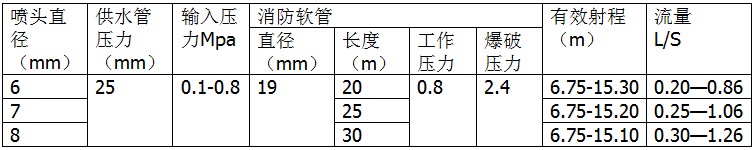 消防軟管長度有20m、25m兩種規格,軟管內徑φ19mm,進水口采Rc1閘閥連接,出水口采用噴嘴直徑為φ6mm的Rc1/2球閥作噴頭。