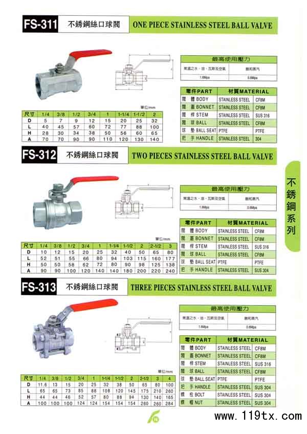 臺灣富山FS313不銹鋼三片式球閥技術參數: