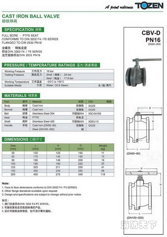 3、TOZEN CBV-D鑄鐵法蘭球閥緊密可靠。它有兩個密封面,而且球閥的密封面材料廣泛使用各種塑料,密封性好,能實現(xiàn)完全密封。在真空系統(tǒng)中也已廣泛使用。