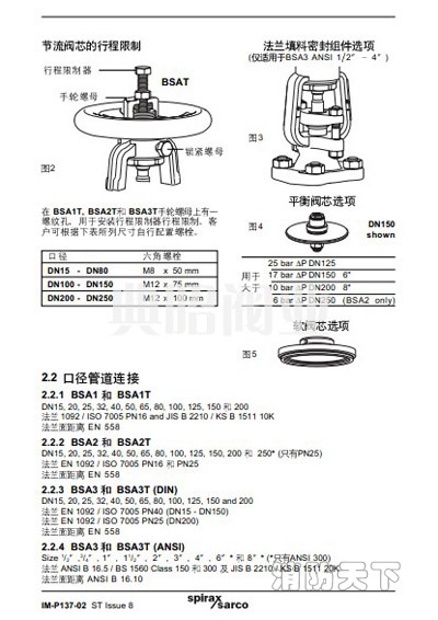 英國斯派莎克波紋管截止閥,BSA2T波紋管蒸汽截止閥的BSA系列波紋管密封截止閥采用獨(dú)特的波紋管密封設(shè)計,從而完全消除了閥桿填料密封泄漏的問題,滿足最嚴(yán)格的泄漏等級要求。斯派莎克SpiraxSarco截止閥BSA型截止閥的零泄漏特性改善了設(shè)備的安全性,節(jié)約大量能源,減少了維修費(fèi)用,并為工業(yè)應(yīng)用提供了清潔安全的工作環(huán)境。斯派莎克SpiraxSarco截止閥BSA型波紋管密封截止閥的口徑從DN15-DN250,可提供各種不同的材質(zhì),從鑄鐵材質(zhì)的BSA1,球墨鑄鐵的BSA2和鑄鋼材質(zhì)的BSA3型截止閥連接標(biāo)準(zhǔn)有法蘭,螺紋和承插焊接等,壓力等級可達(dá)PN40,ANSI 300和CLASS 800。最高工作溫度可425C°,英國斯派莎克SpiraxSarco截止閥可用于高溫系統(tǒng).從而用一種閥即可滿足各種不同的工業(yè)應(yīng)用要求,并確保長的使用壽命,免維修及堅固結(jié)實。