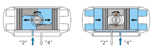 當氣源壓力從氣口(2)進入氣缸兩活塞之間中腔時,使兩活塞分離向氣缸兩端方向移動,兩端氣腔的空氣通過氣口(4)排出,同時使兩活塞齒條同步帶動輸出軸 (齒輪)逆時針方向旋轉。反之氣源壓力從氣口(4)進入氣缸兩端氣腔時,使兩活塞向氣缸中間方向移動,中間氣腔的空氣通過氣口(2)排出,同時使兩活塞齒條同步帶動輸出軸(齒輪)順時針方向旋轉。(如果把活塞相對反方向安裝,輸出軸即變為反向旋轉)