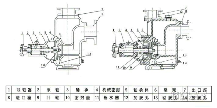 ZX系列自吸泵均采用軸向回液的泵體結構。泵體由吸入室、儲液室、渦卷室、回液孔、氣液分離室等組成. 泵正常起動后.葉輪將吸入室所存的液體及吸入管路中的空氣一起吸入,井在葉輪內得以完全混合, 在離心力的作用下.液體夾帶著氣體向渦卷室外緣流動、在葉輪的外緣上形成有一定厚度的白色泡沫帶及高速旋轉液環。氣液混合體通過擴散管進入氣液分離室。此時,由于流速突然降低,較輕的氣體從混合氣液中被分離出來.氣體通過泵體吐出口繼續上升排出。脫氣后的液體回到儲液室,并由回流孔再次進入葉輪,與葉掄內部從吸入管路中吸入的氣體再次混合,在高速旋轉的葉輪作用下,又流向葉輪外緣……。隨著這個過程周而復始地進行下去,吸入管路中的空氣不斷減少.直到吸盡氣體,完成自吸過程,泵便投入正常作業。 在一些泵的軸承體底部還沒有冷卻室。當軸承發熱引起軸承體溫升超過70℃時,可在冷卻室處通過任意一只冷卻液管接頭,注入冷卻液循環冷卻。泵內部防止液體由高壓區向低壓區泄漏的密封機構是前后密封環,前密封環裝在泵體上,后密封環裝在軸承體上,當泵經長期運轉密封環磨損到一定程度.并影響到泵的效率和自吸性能時.應給予更換。