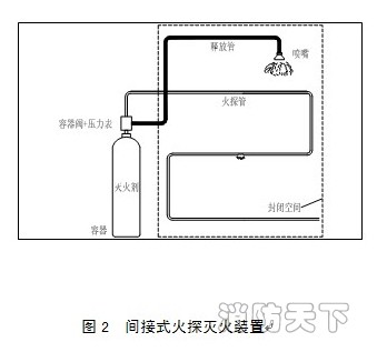火探管通過容器閥連接到滅火劑容器上,進行火源探測,遇火時火探管爆破,利用火探管中的壓力下降,啟動容器閥,通過釋放管至噴嘴把滅火劑釋放出來。